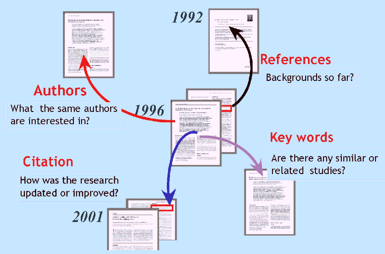 4.関連研究の検索:図中の1992年、1996年、あるいは、新しく見つかった2001年の論文の中から、キーワード(模式図内→の矢印)、および、研究の中心となった著者名(最初の著者、あるいは、同様の論文を複数出している人物、模式図内←の矢印)を抽出する。これらのキーワード・著者検索により、別の研究者によって発表された同分野の論文を抽出することができる。その研究が、どのような興味や観点で研究を進めているか(現在の自分の発想と同じか否かも)を調べることもできる。この検索には、できるだけ広範な内容や多くの研究雑誌を扱ったデータベースを使用するのが望ましい。